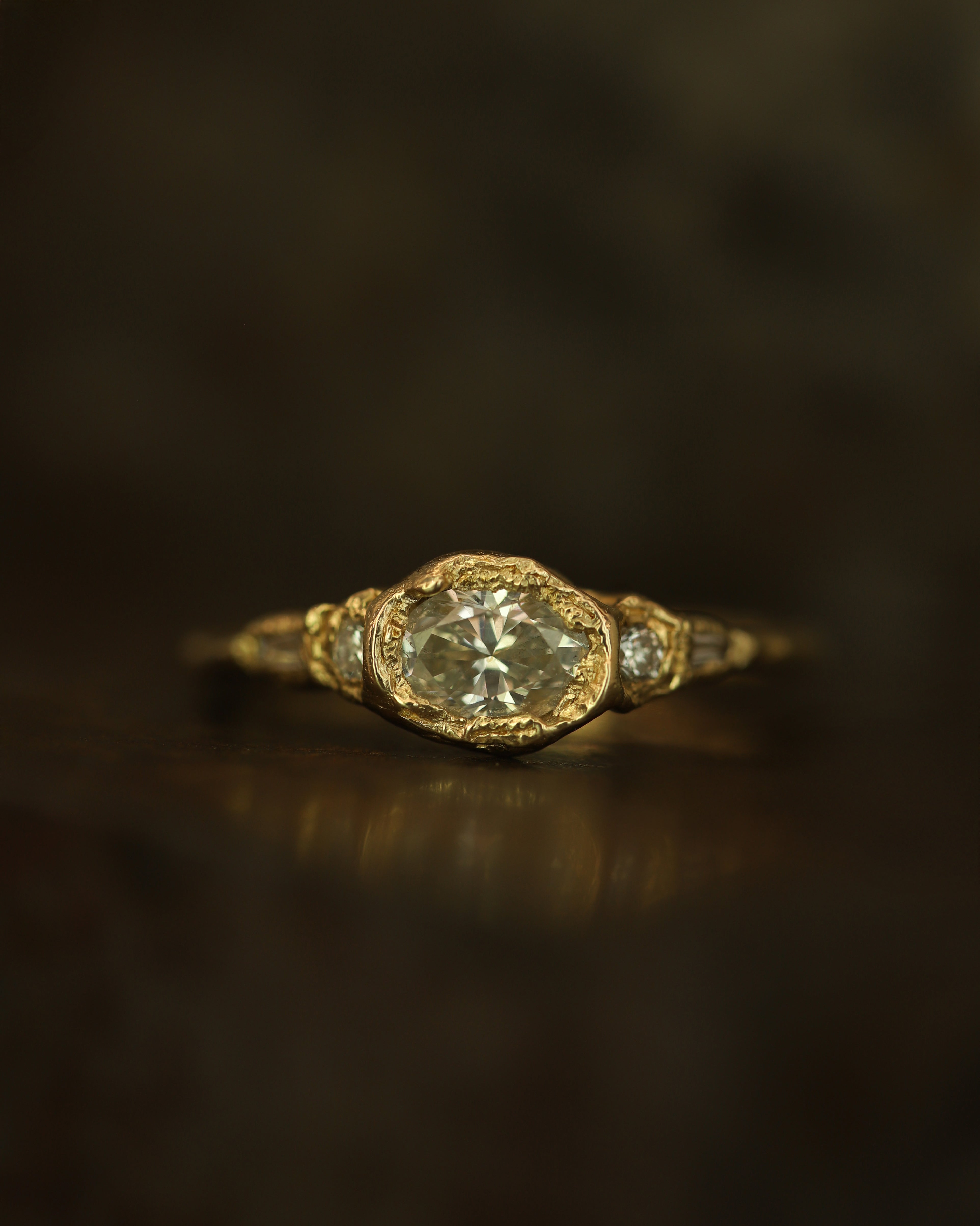 The Armach 1ct Oval Lemon Five Stone Diamond Organic Engagement Ring is inspired by the medieval jewellery hoards which have been found across Scotland.
