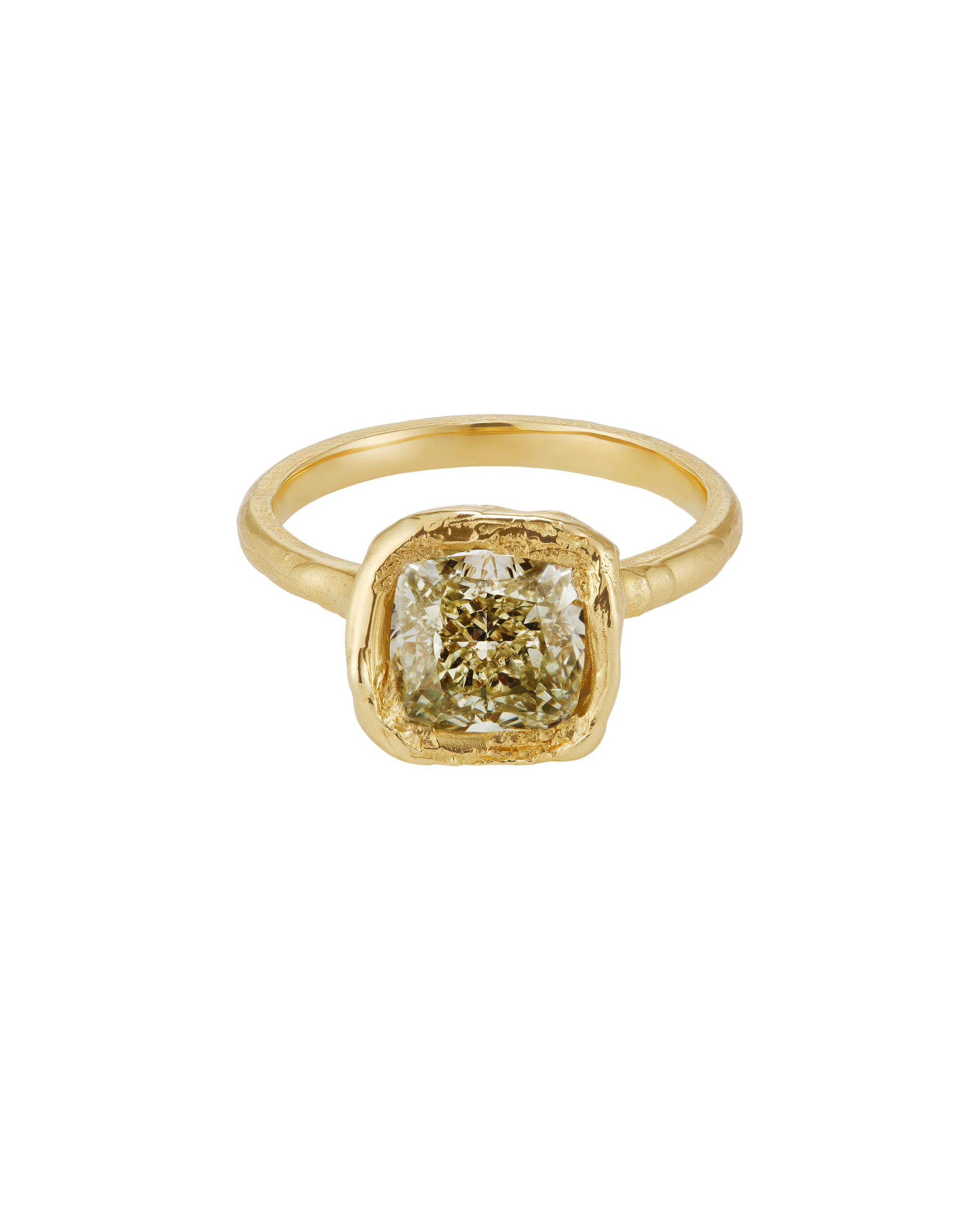 The Armach 2.6ct Cushion Fancy Lemon Diamond Organic Engagement Ring is inspired by the medieval jewellery hoards which have been found across Scotland.