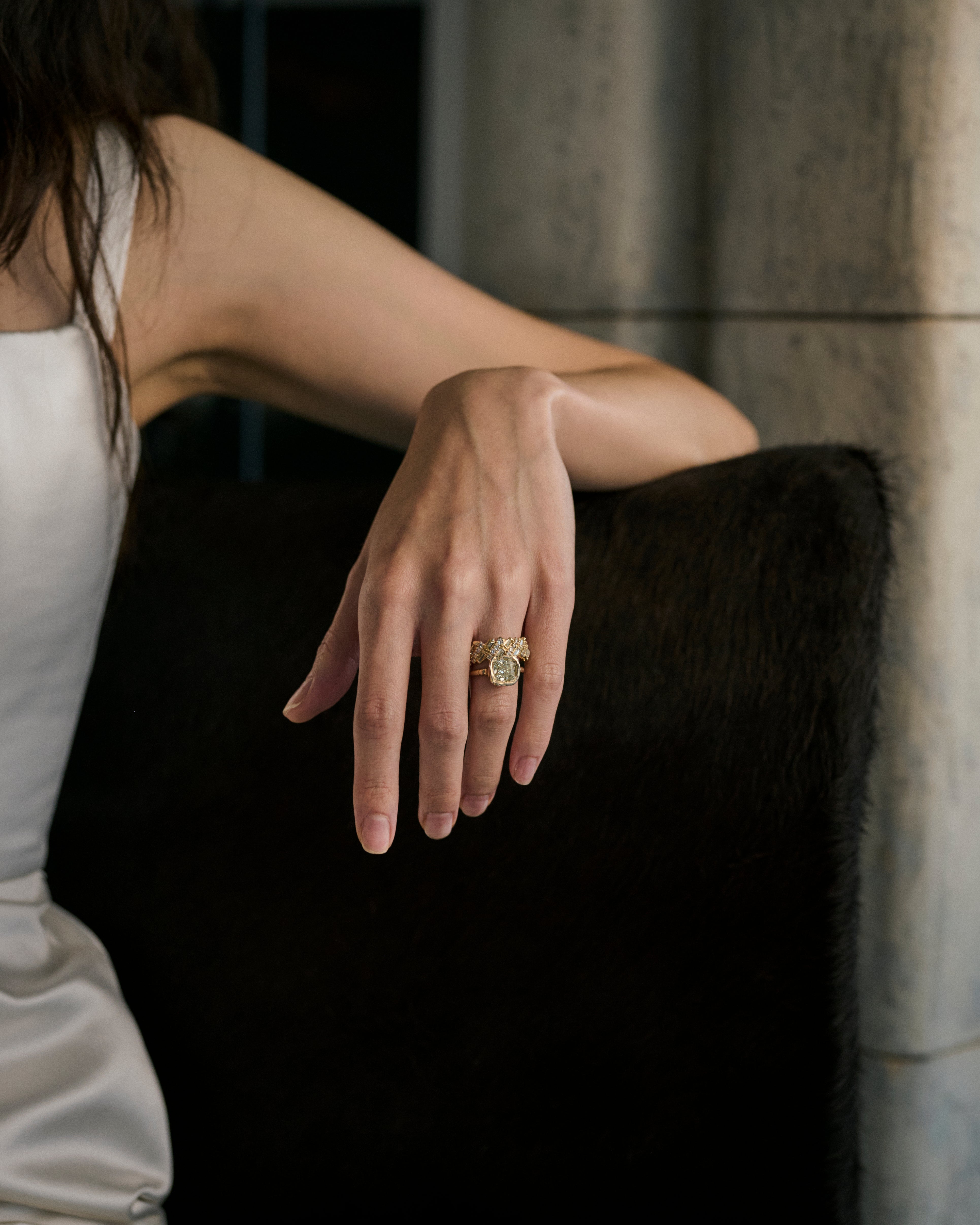Its softly distressed band and erosive setting contrast with the vivid lemon honey hue of the diamond. A distinctive choice for an alternative engagement ring or a bold statement piece. Pair with organic wedding bands from the collection for a cohesive look.