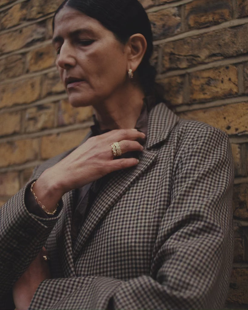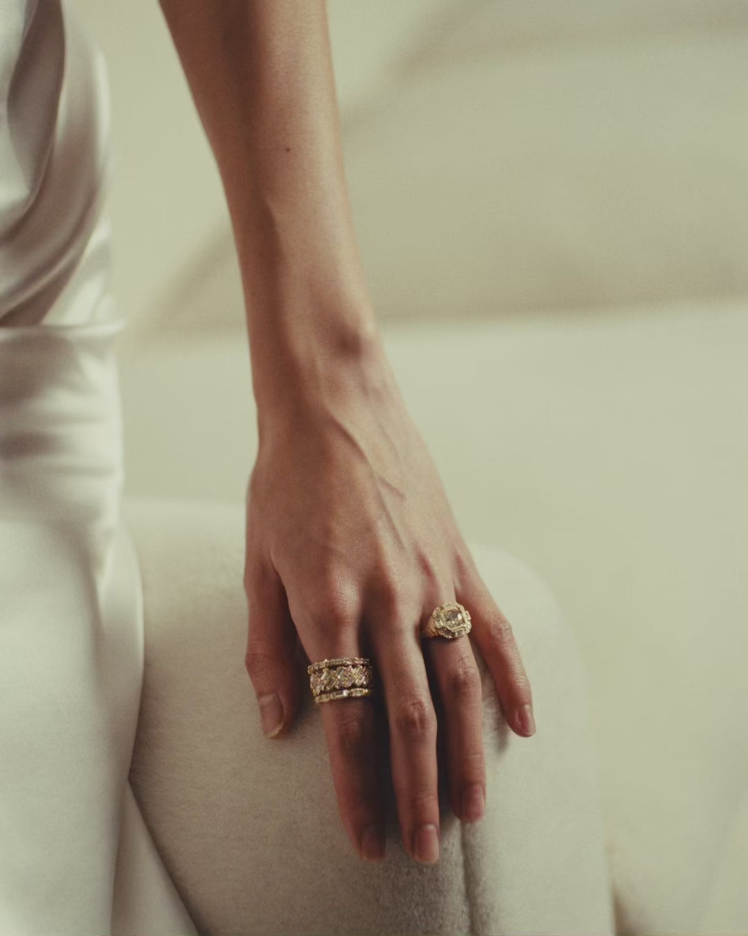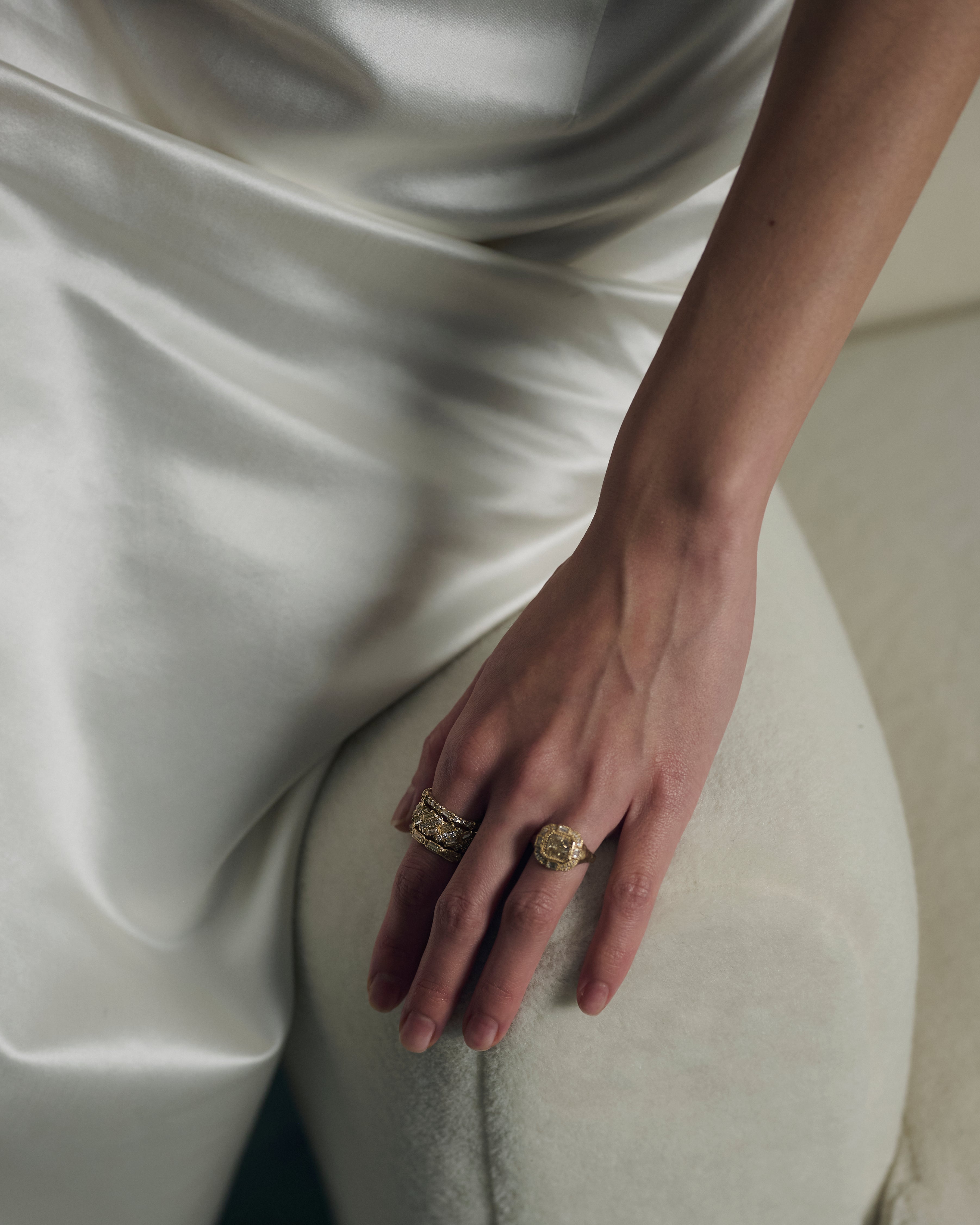 Ellis discovered ancient weaponry on her family farmland - objects of protection and defence. The Armach collection reimagines what we mean by armour; a combination of diamonds and gold, worn for confidence and strength.