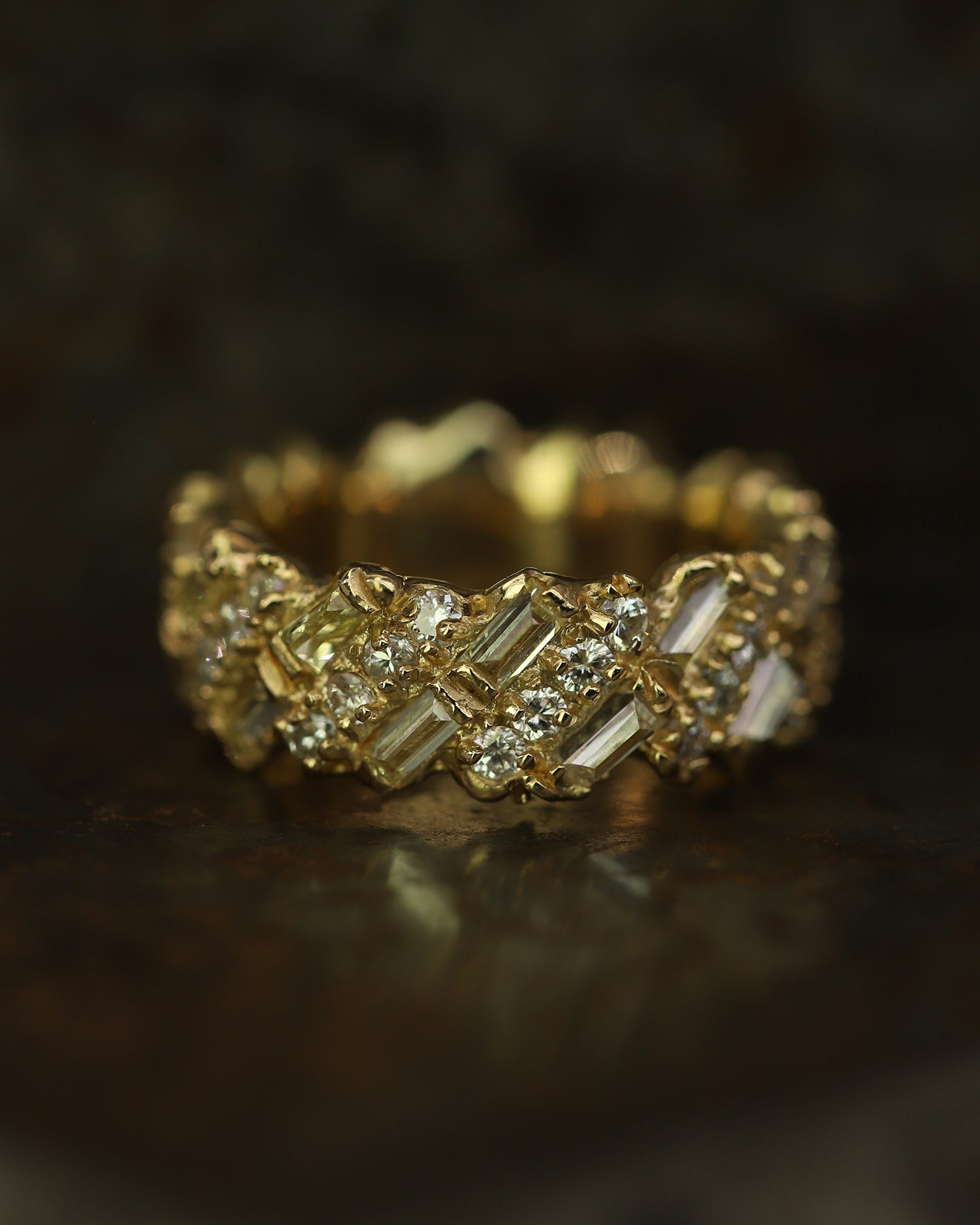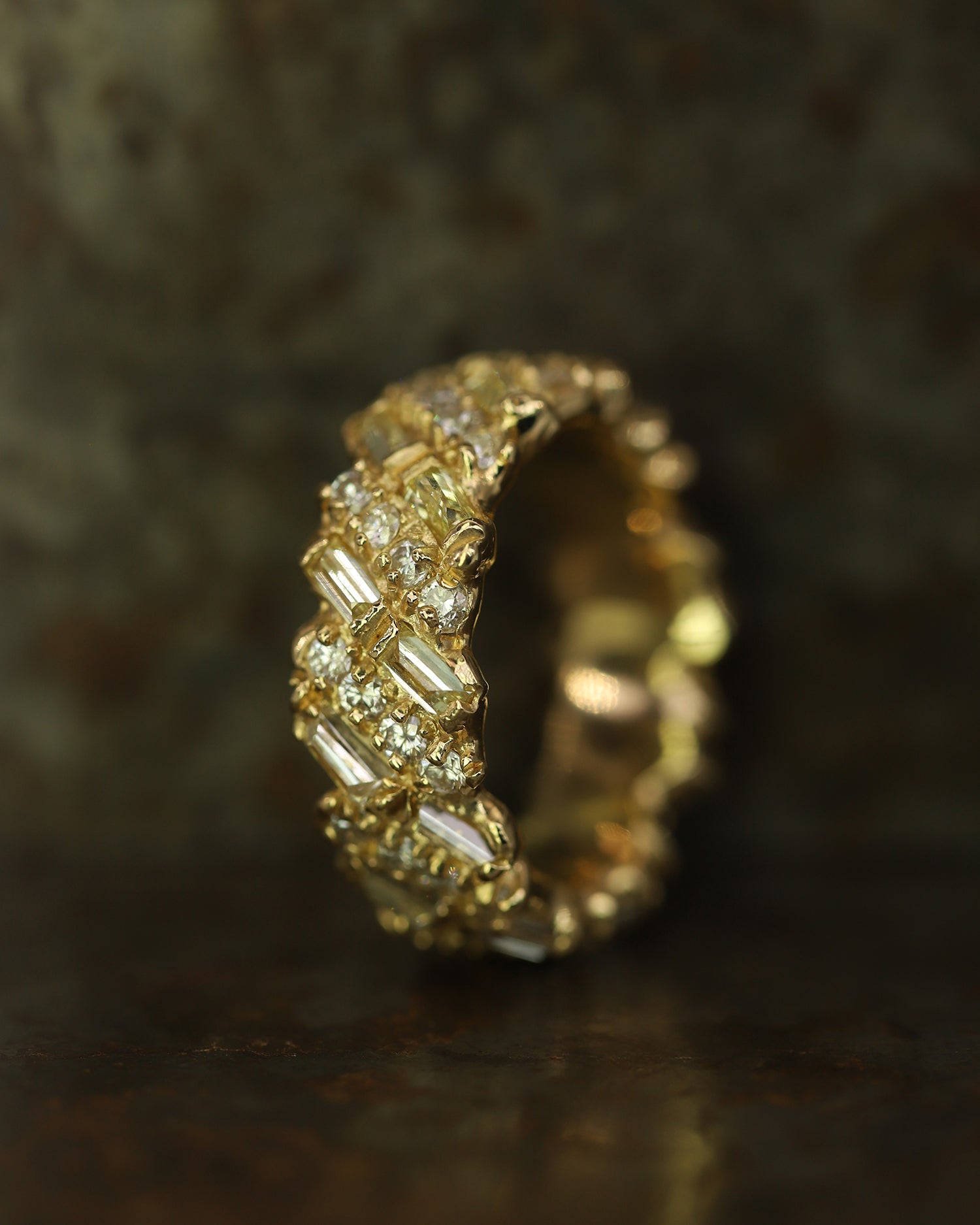 The Armach Diamond Eternity Ring II is inspired by the medieval jewellery hoards which have been found across Scotland. White & lemon diamonds flow into one another, organically set as though they have just been excavated. Perfect as an alternative wedding ring, eternity ring or everyday ring. Wear solo or stack up with other rings in the collection.
