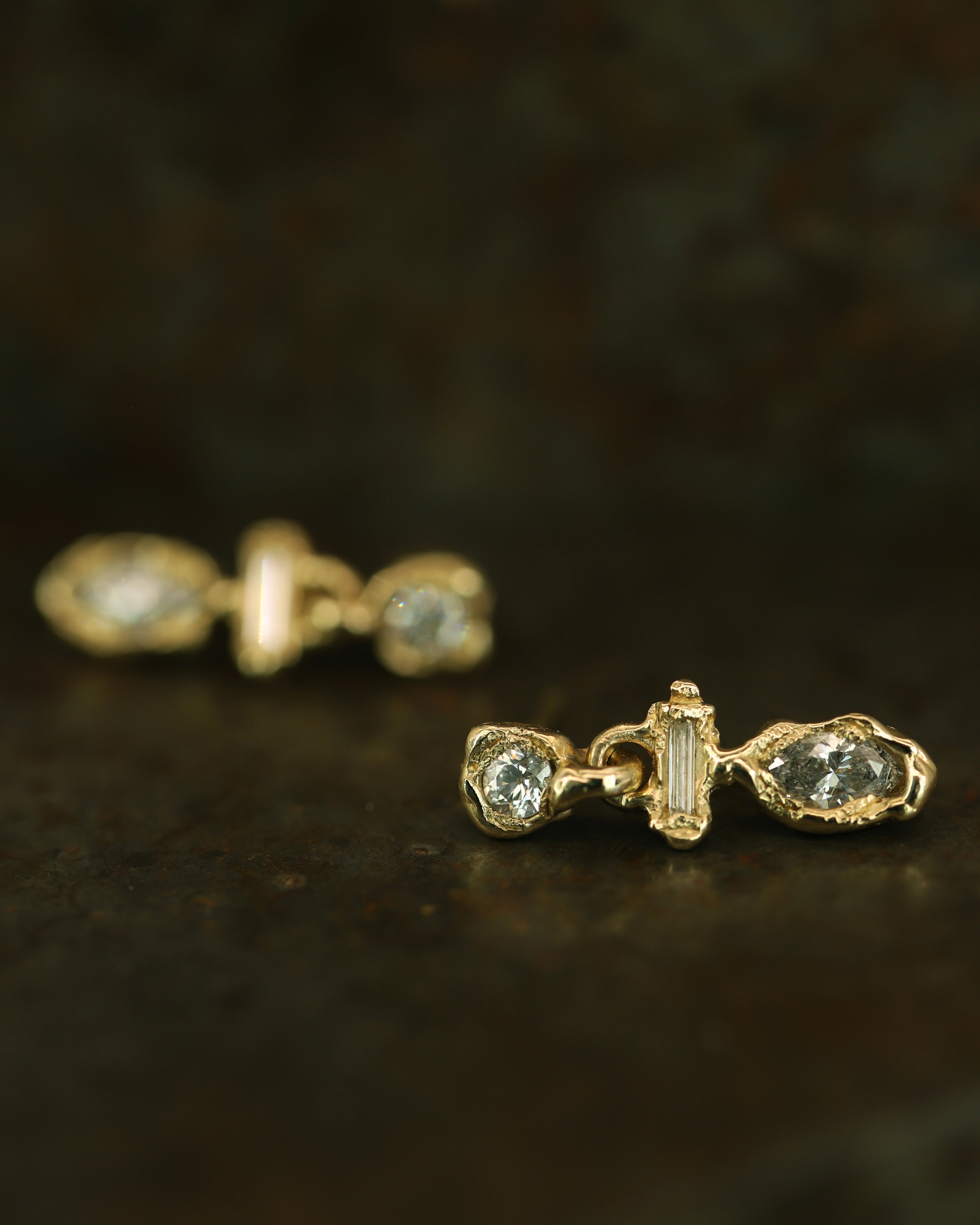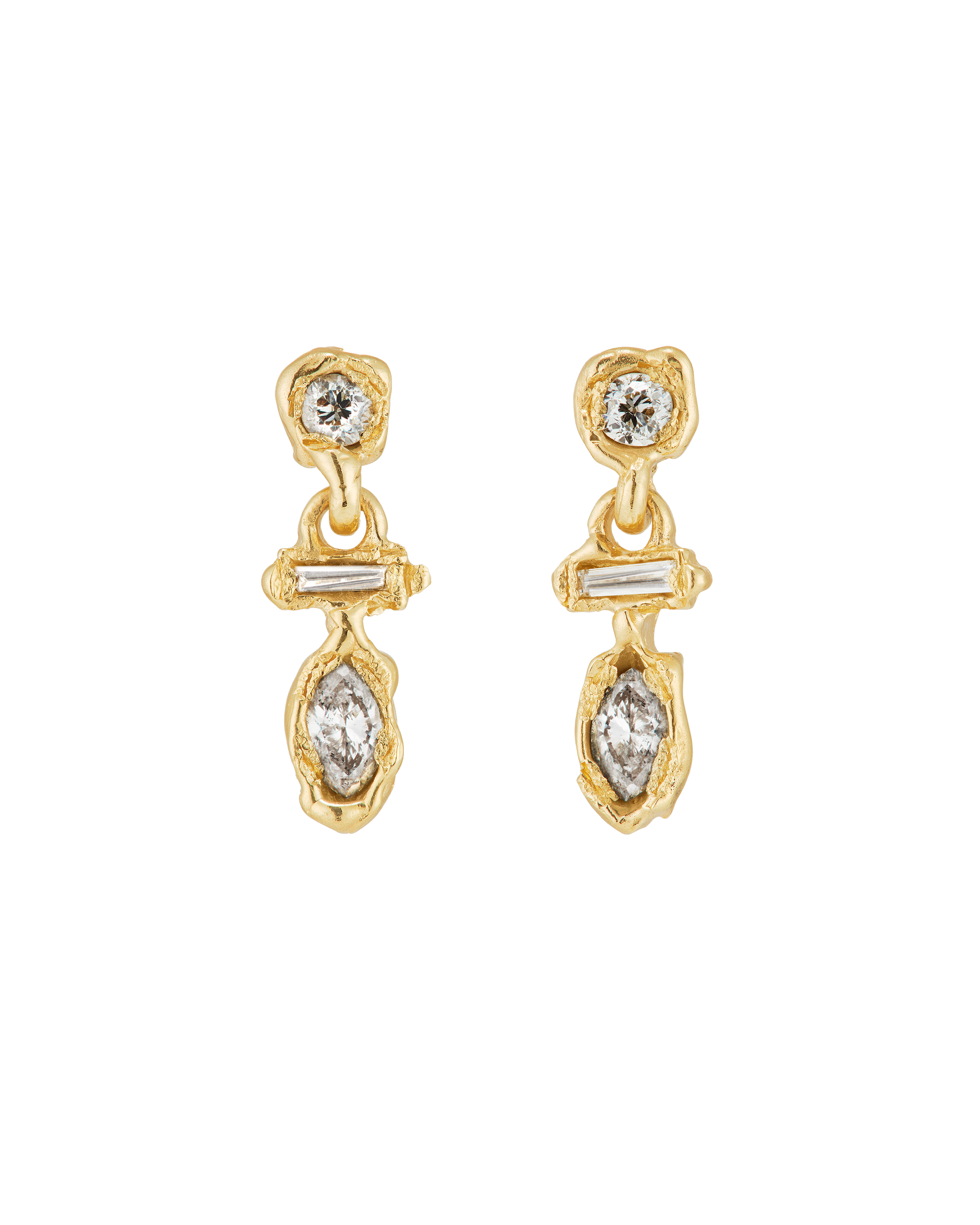 Intricately detailed, the subtle texture of the earrings catch in the light, contrasting with the mixed cut diamonds. Wear solo, or pair with smaller studs in the collection for a fully curated ear. The perfect statement earring.