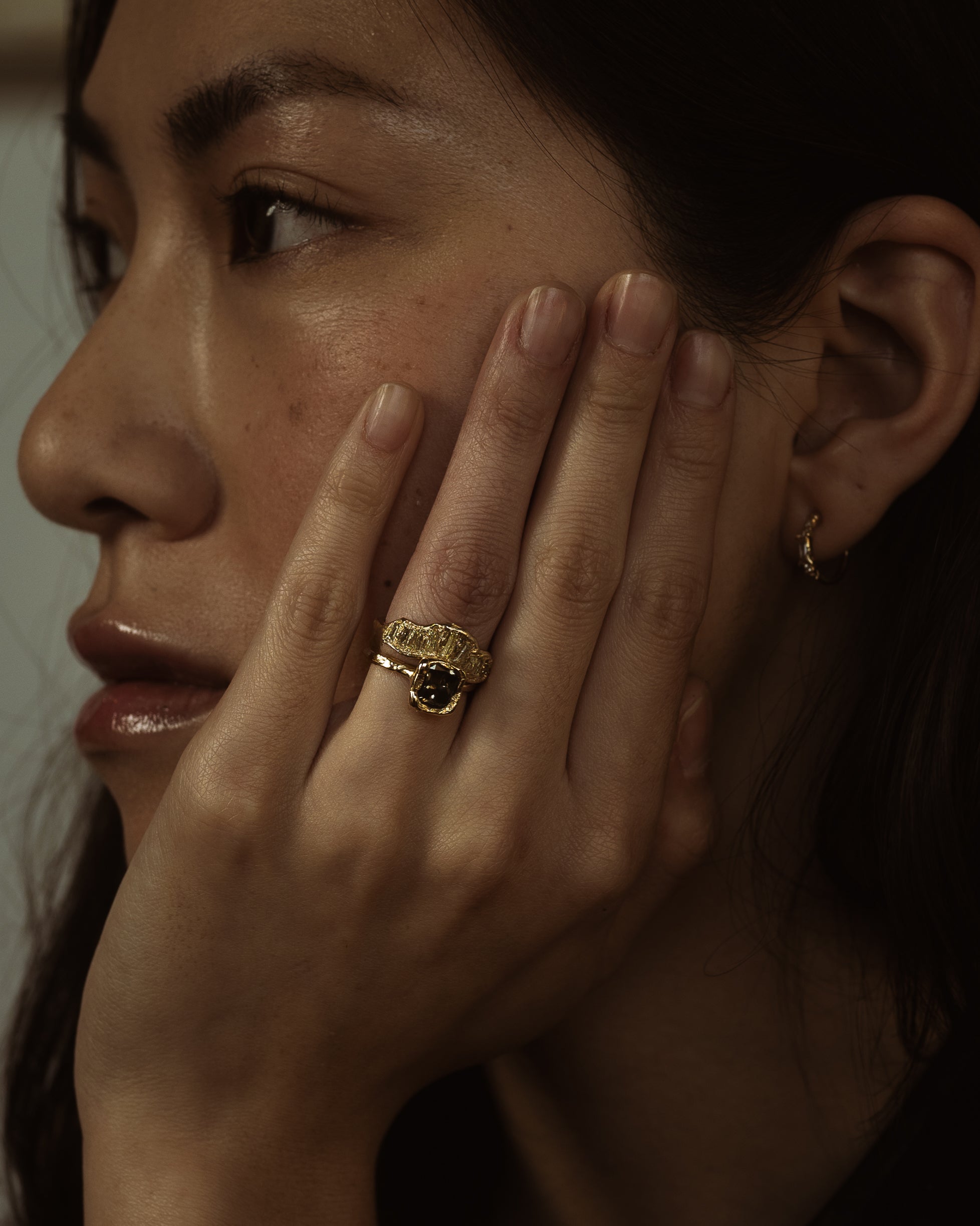 Excavations explores tonal, coloured diamonds set in molten gold; each stone carefully chosen for its one-of-a-kind hue, from rich browns and mossy greens to soft ambers and greys.