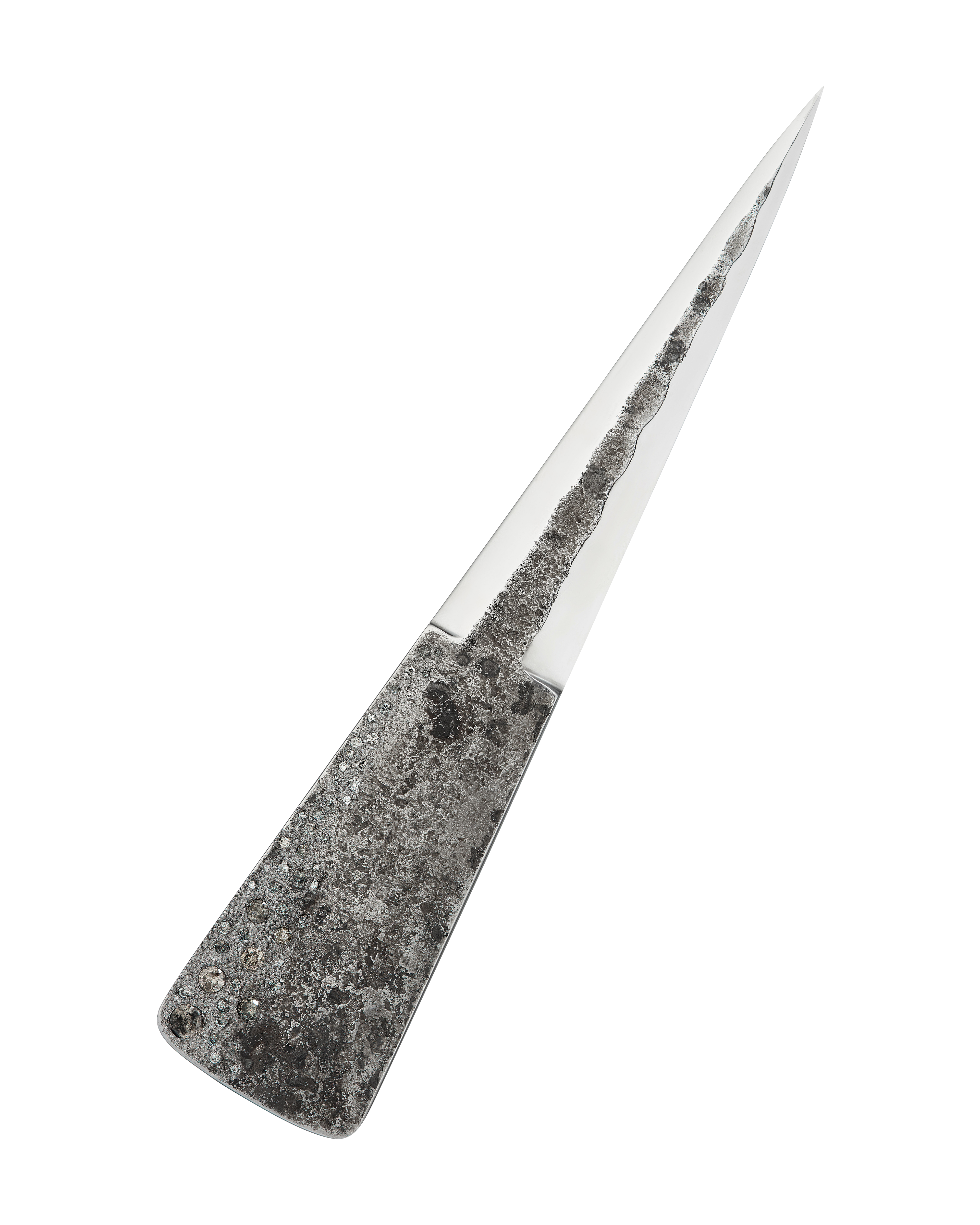 The blade features a three-layer san-mai construction, with a 52100 steel core and vintage iron cladding from Sheffield, set with 4.5 carats of natural coloured salt and pepper diamonds.