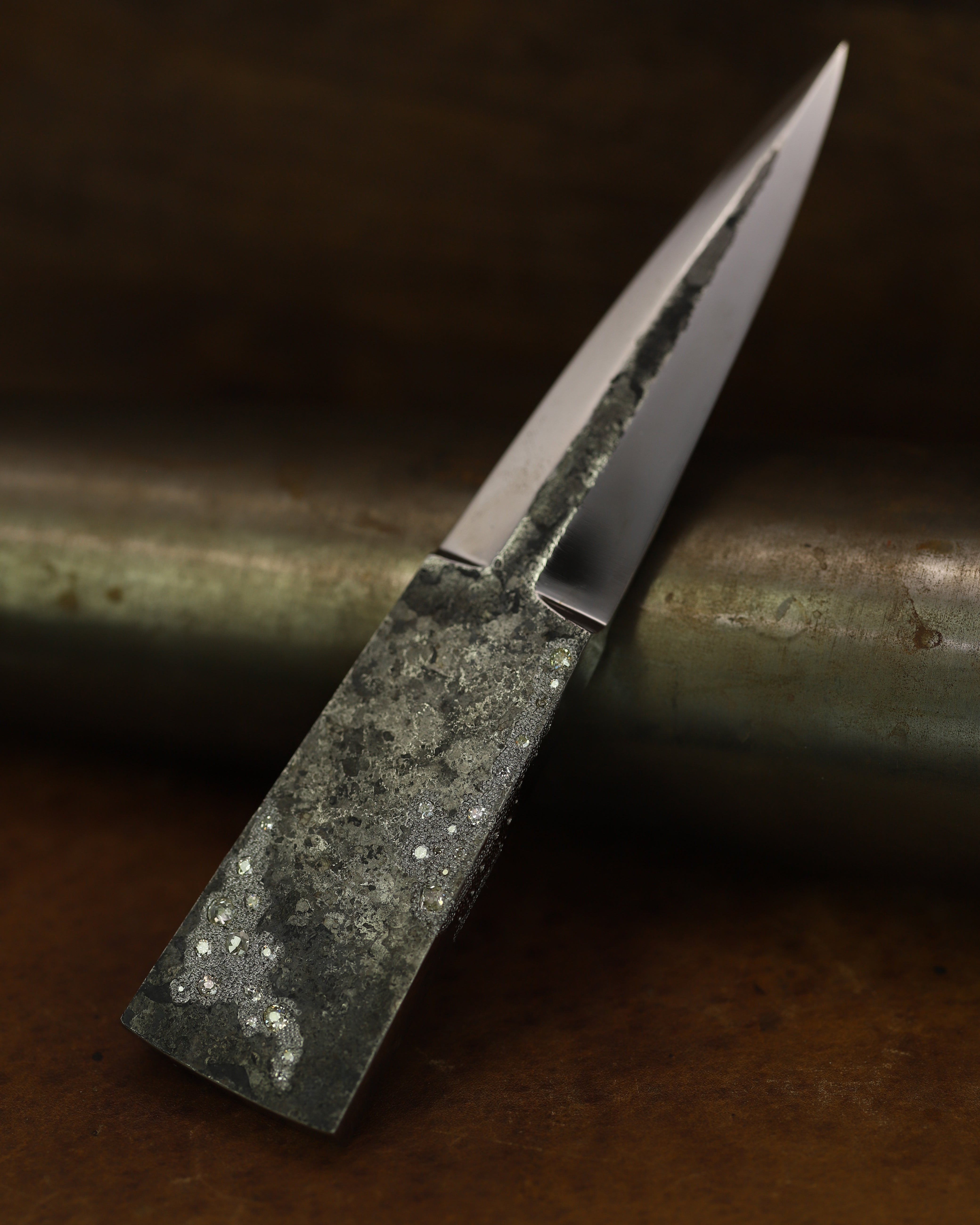 - Materials: Three-layer san-mai construction, with a 52100 steel core and vintage iron cladding from Sheffield, set with old cut antique diamonds.