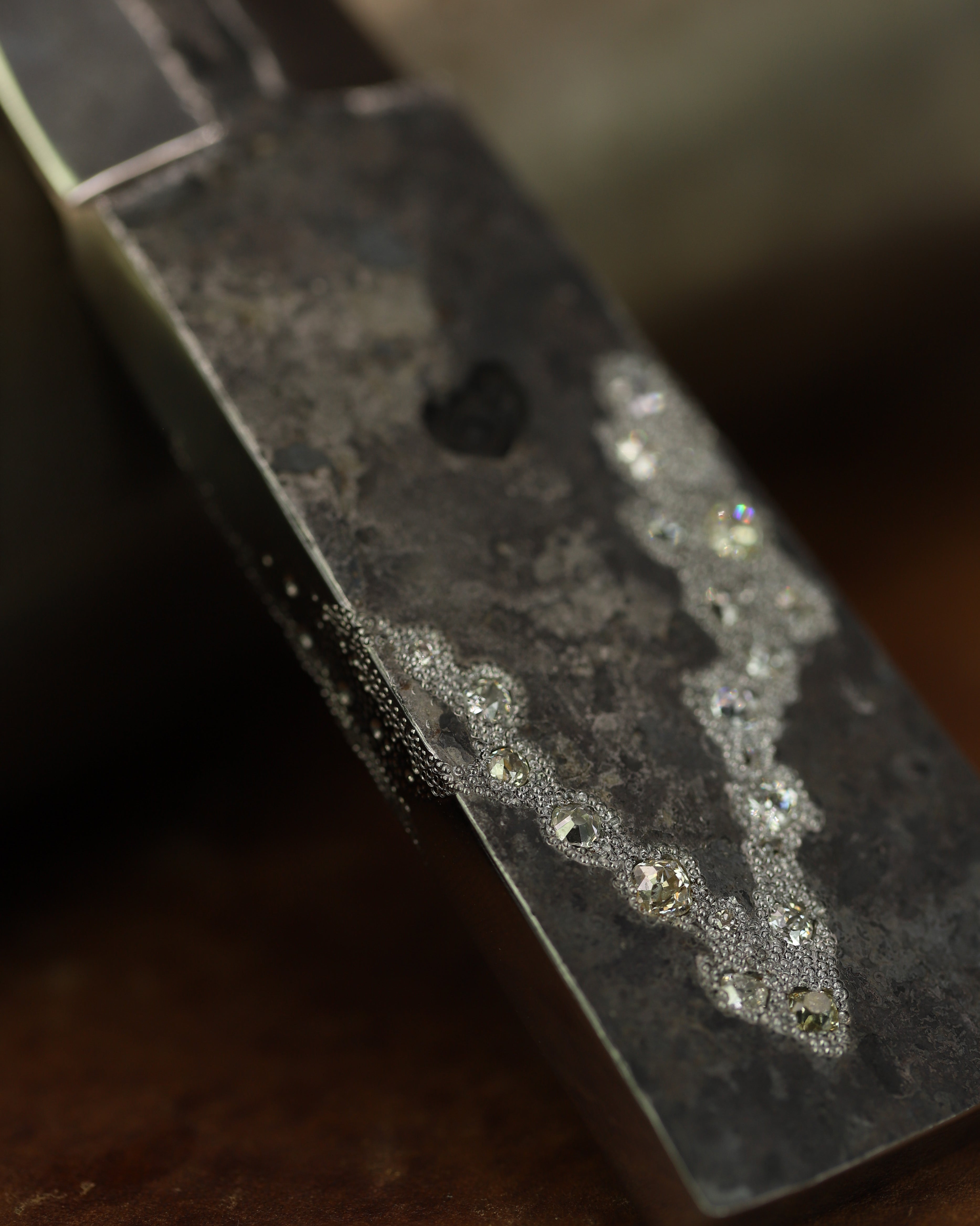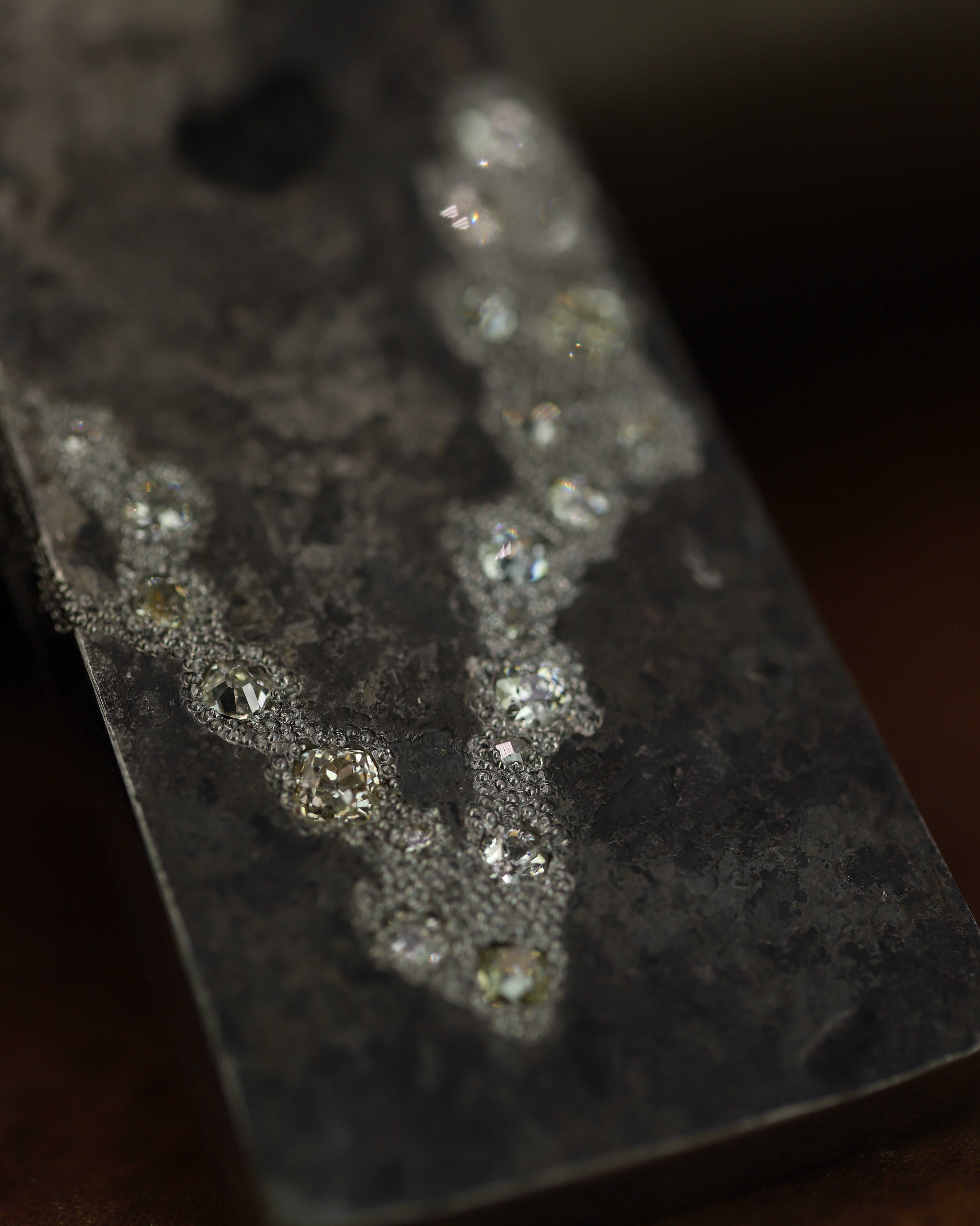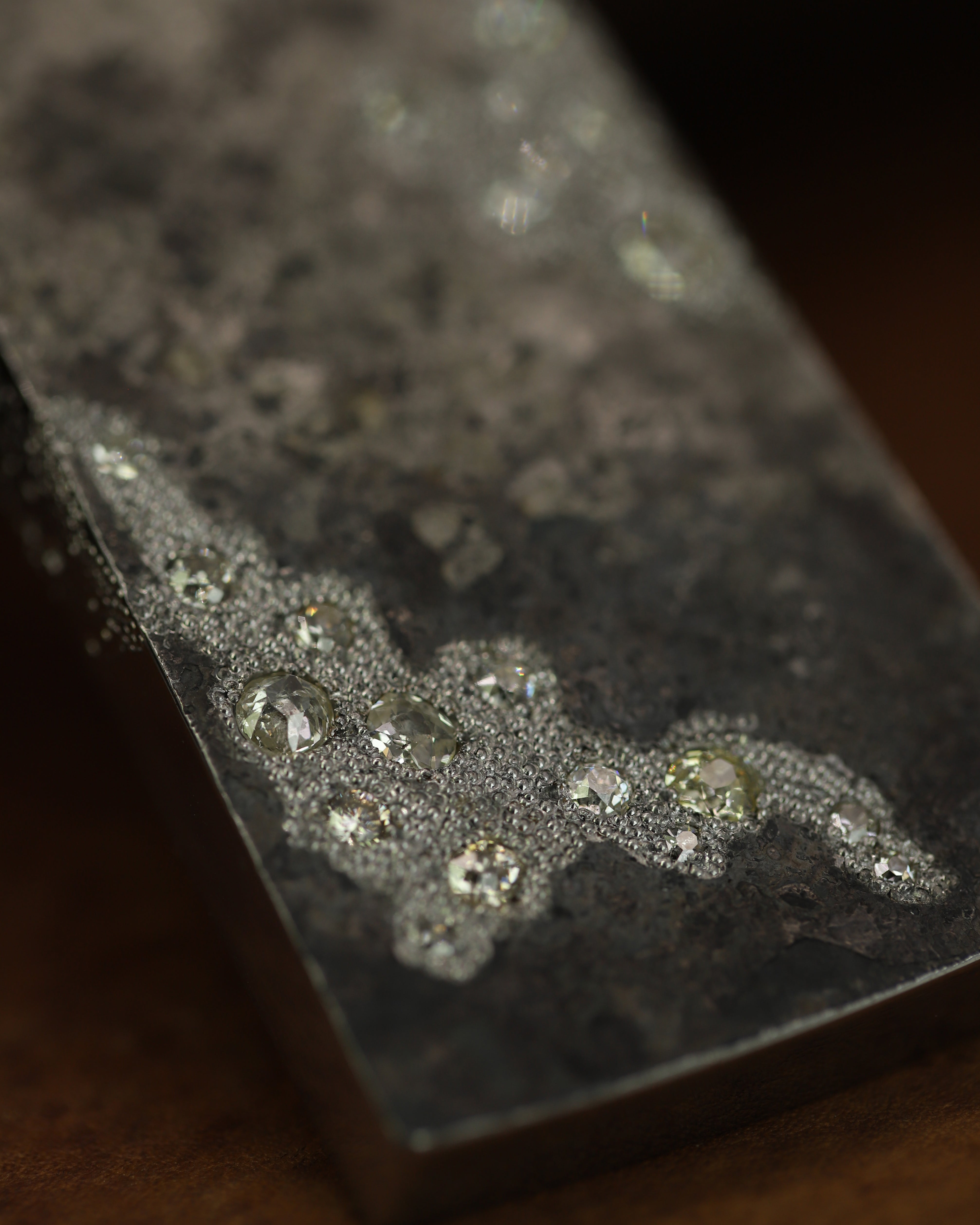 The blade features a three-layer san-mai construction, with a 52100 steel core and vintage iron cladding from Sheffield. The blade is hand engraved and set with 7.5 carats of old cut antique diamonds; hand-cut stones from the 1800s and early 1900s, shaped long before the age of modern precision.