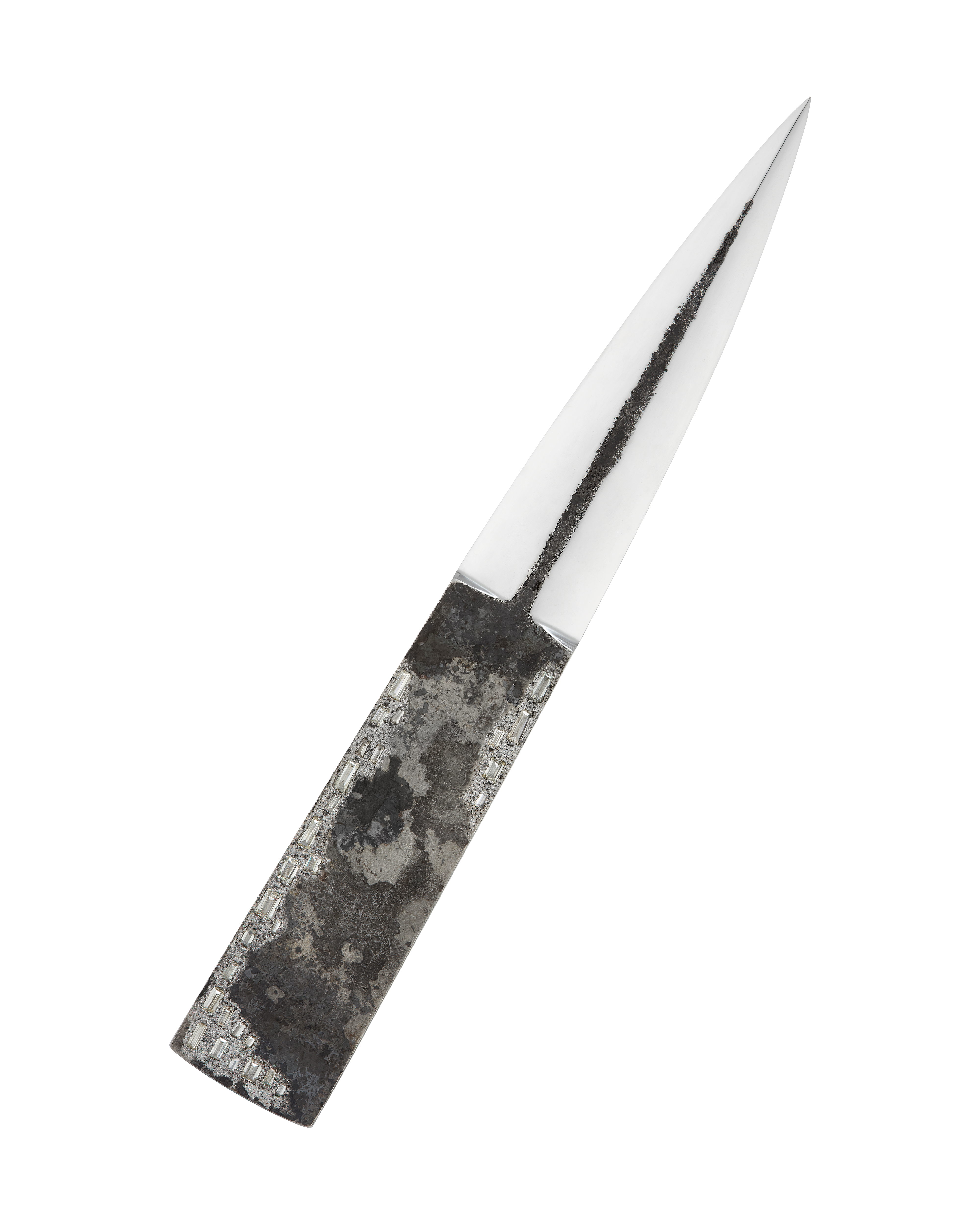 - Materials: Three-layer san-mai construction, with a 52100 steel core and vintage iron cladding from Sheffield, set with baguette cut white diamonds.