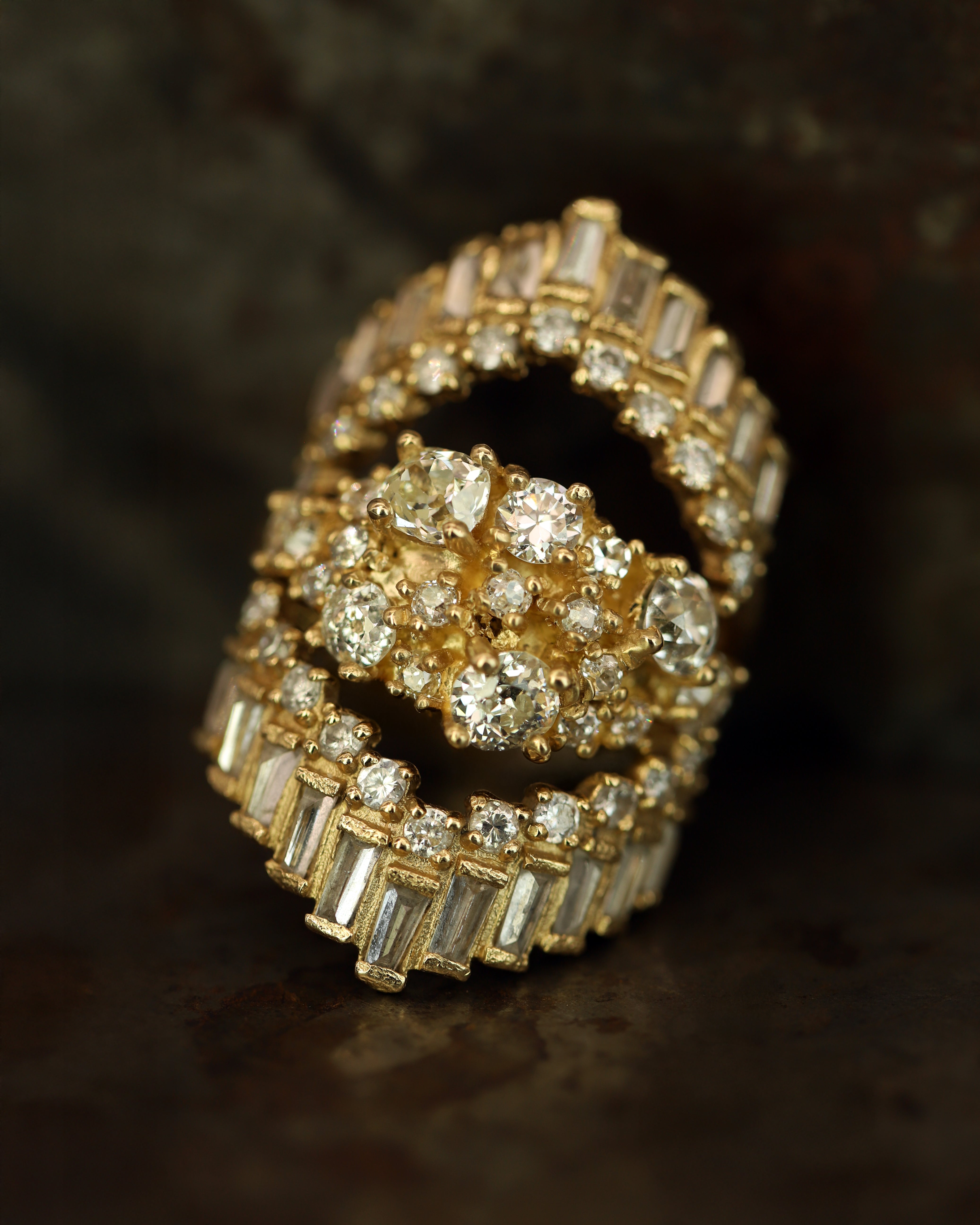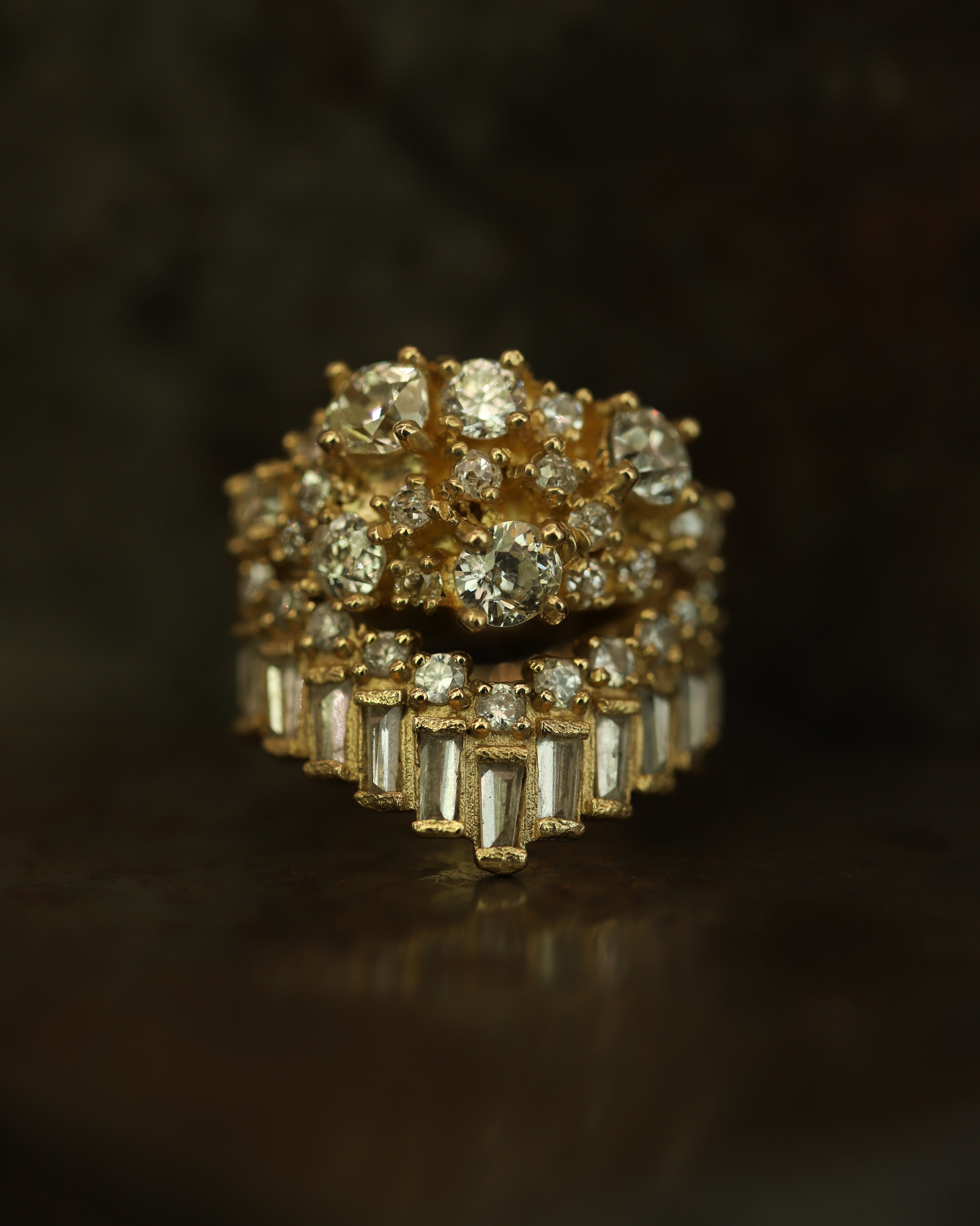The softly distressed texture of the ring band contrasts with the clusters of old cut diamonds. This would make a stunning alternative engagement ring, or statement ring.